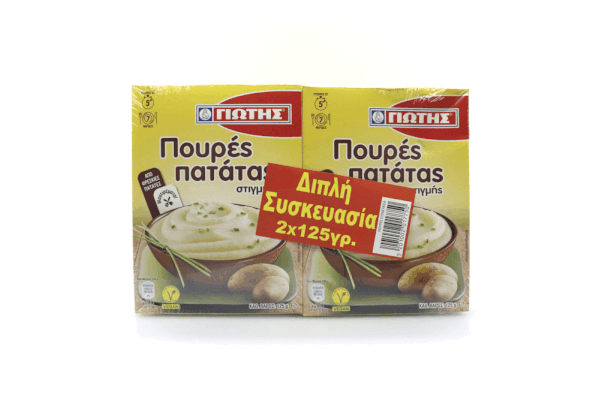 Νιφάδες αφυδατωμένης πατάτας 99% ,Γαλακτωματοποιητής : μονο και διγλυκερίδια των λιπαρών οξέων, Αντιοξειδωτκα :παλμιτικό ασκορβύλιο , πυροθειώδες νάτριο , Σταθεροποιητης: δισόξινο πυροφωσφορικό νάτριο, Ρυθμιστής οξύτητας :κιτρικό οξύ ,Κουρκουμάς